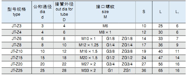 *標記示例:①:卡套式三通終端管接頭 公稱通徑Ø6MM JT-3T-Z6 M10×1