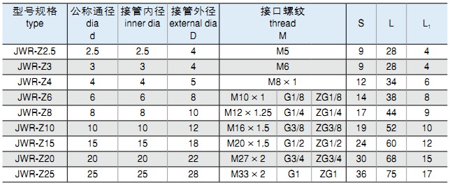 一、JWR系列外插式管接頭,適用于連接軟質(zhì)尼龍管,塑料管及膠管。最大工作壓力為1.0MPa。該系列接頭具有結(jié)構(gòu)簡單,使用方便,安裝牢固等優(yōu)點。