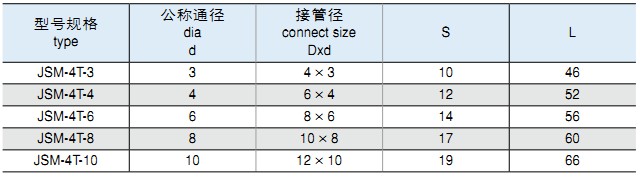 安裝及應(yīng)用一、JSM系列鎖母式管接頭,適用于連接尼龍管、塑料管,最大工作壓力為1.0MPa。該系列管接頭具有使用方便,安裝牢固等優(yōu)點(diǎn)。二、先將鎖母卸下套入連接管上,把連接管插入接頭上,再將鎖母旋緊接頭即可。• 標(biāo)記示例: ①: