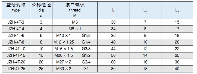 • 標(biāo)記示例: ①:組合式三通終端管接頭 公稱通徑 Ø6MM JZH-3T-Z6 M10×1