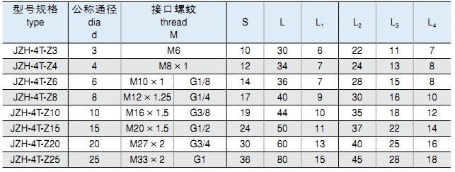 • 標記示例: ①:組合式三通終端管接頭 公稱通徑 Ø6MM JZH-3T-Z6 M10×1