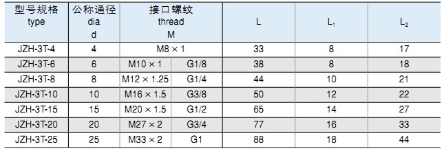 • 標記示例: ①:組合式三通終端管接頭 公稱通徑 Ø6MM JZH-3T-Z6 M10×1