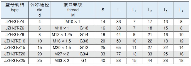 • 標(biāo)記示例: ①:組合式三通終端管接頭 公稱通徑 Ø6MM JZH-3T-Z6 M10×1