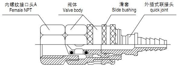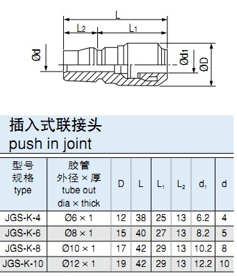 型號規(guī)格說明,下圖例JGS-W-6A(JGS-K-6B)插入式外螺紋接口。高性能快速接頭,外插式內(nèi)螺紋接口。