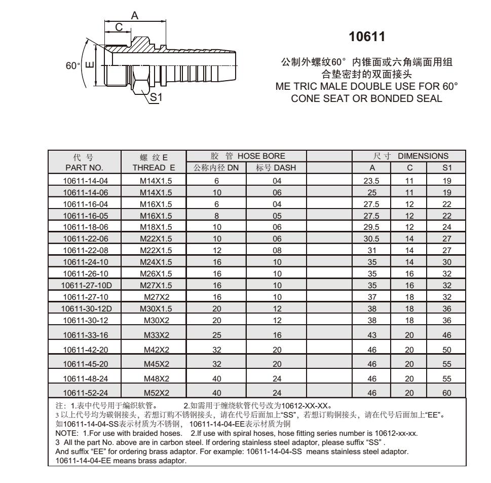 10611 公制外螺紋60°內(nèi)錐面或六角端面用組合墊密封的雙面接頭