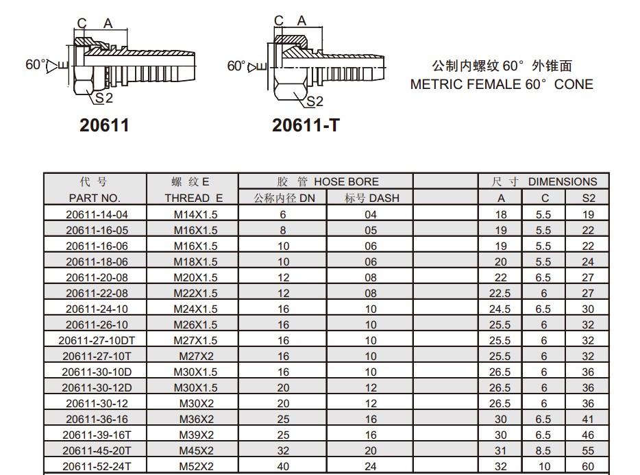 20611 公制內(nèi)螺紋60°外錐面 扣壓式軟管接頭