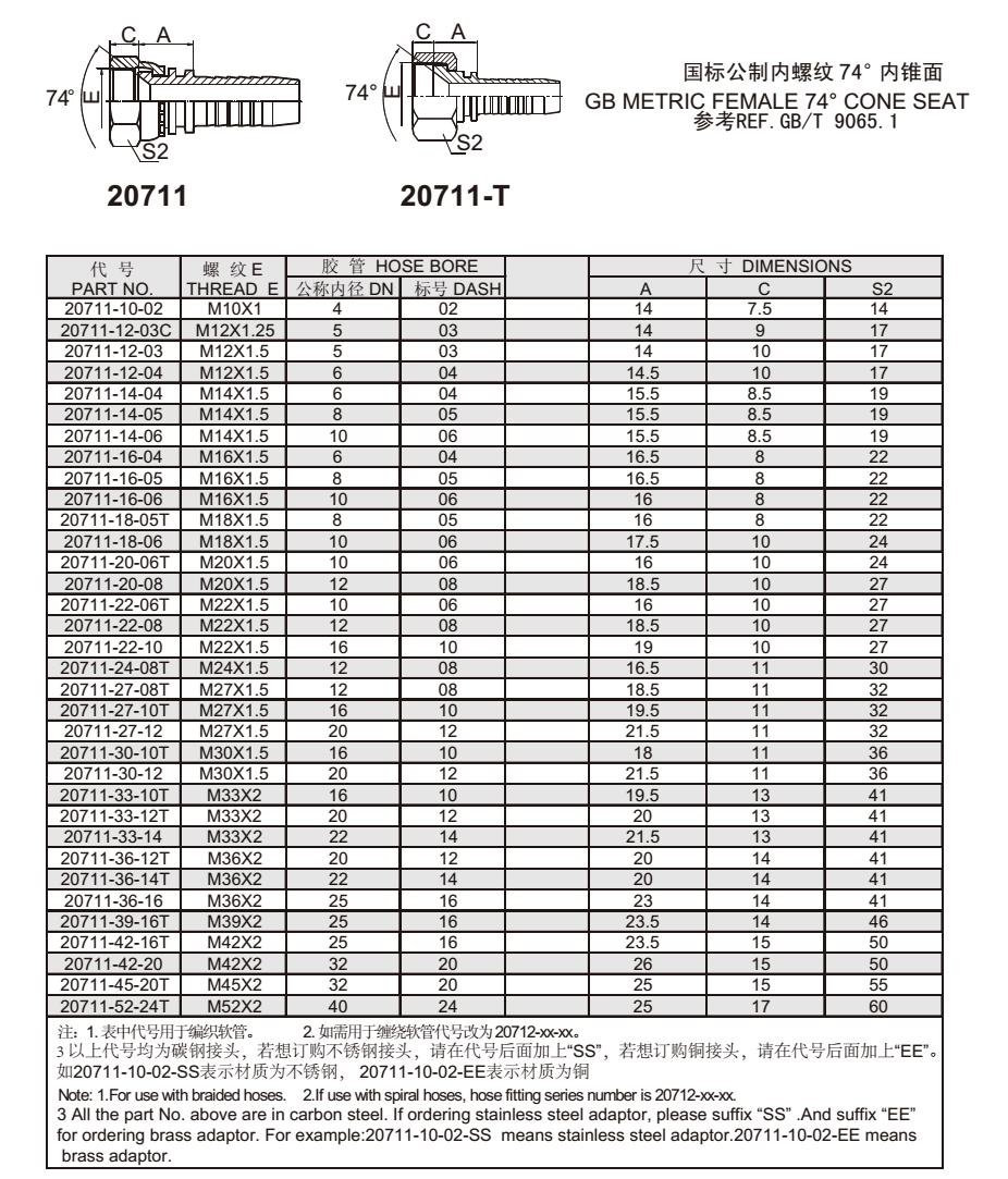 20711 國標公制內(nèi)螺紋74°內(nèi)錐面 扣壓式軟管接頭
