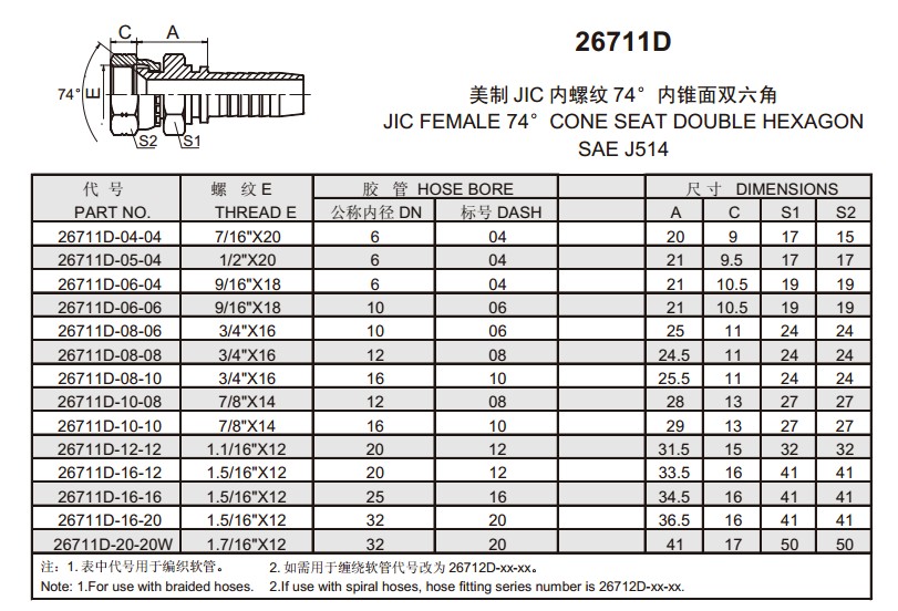 26711D 美制JIC內(nèi)螺紋74°內(nèi)錐面雙六角