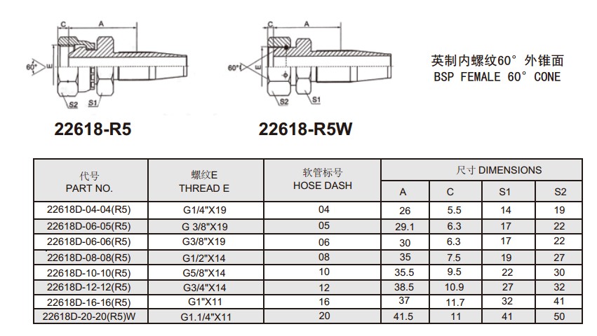 22618-R5 22618-R5W 英制內(nèi)螺紋60°外錐面