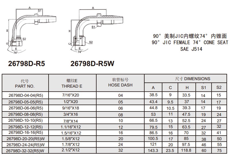26798D-R5 26798D-R5W 90°美制JIC內(nèi)螺紋74°內(nèi)錐面