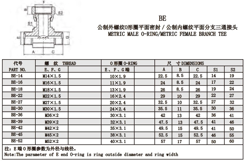 BE 公制外螺紋O形圈平面密封/公制內(nèi)螺紋平面分支三通接頭
