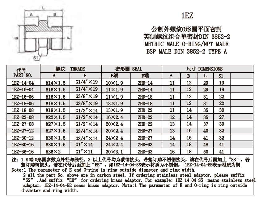 1EZ 公制外螺紋O形圈平面密封英制螺紋組合墊密封DIN 3852-2