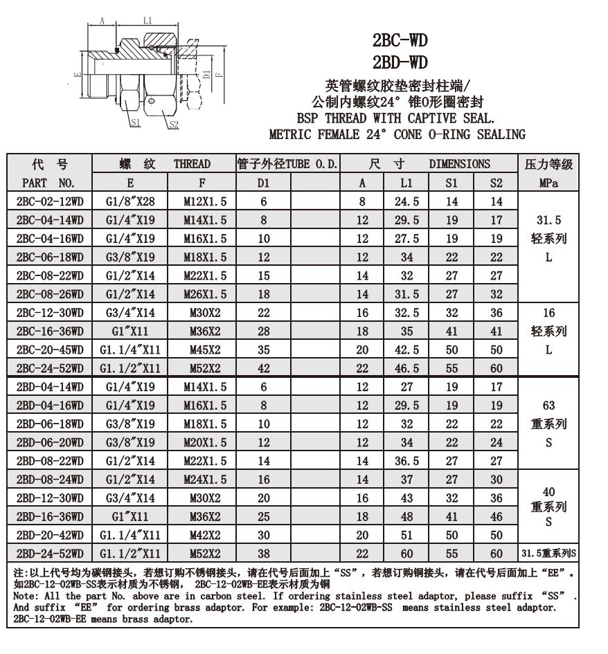2BC-WD 2BD-WD 英管螺紋膠墊密封柱端/公制內(nèi)螺紋24°錐O形圈密封