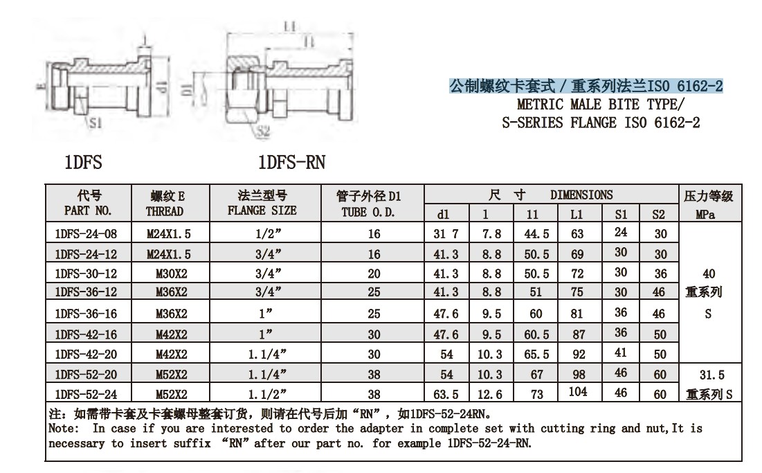 1DFS 1DFS-RN 公制螺紋卡套式/重系列法蘭IS0 6162-2