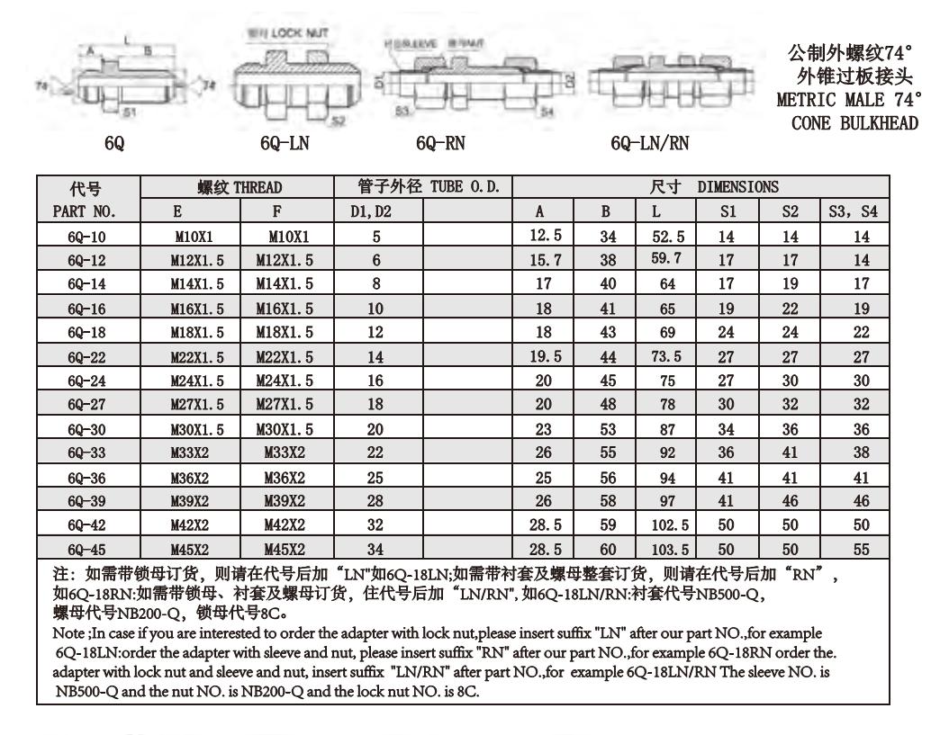 6Q 6Q-LN 6Q-RN 6Q-LN/RN 公制外螺紋74°外錐過板接頭