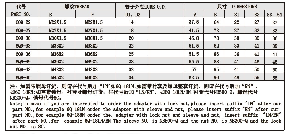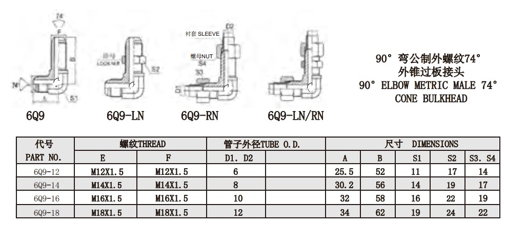 6Q9 6Q9-LN 6Q9-RN 6Q9-LN/RN 90°彎公制外螺紋74°外錐過板接頭