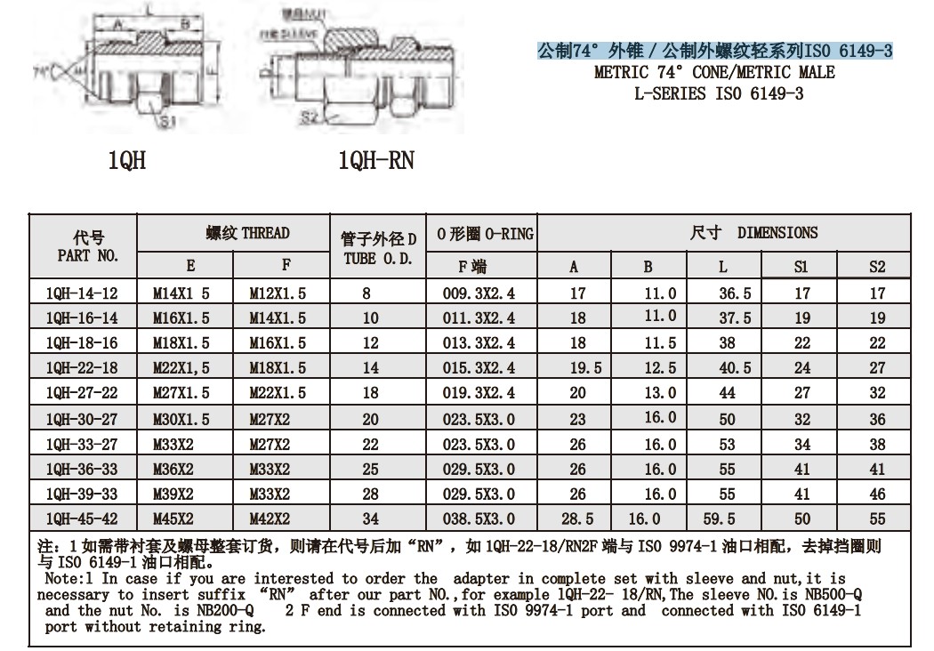 1QH 1QH-RN 公制74°外錐/公制外螺紋輕系列IS0 6149-3