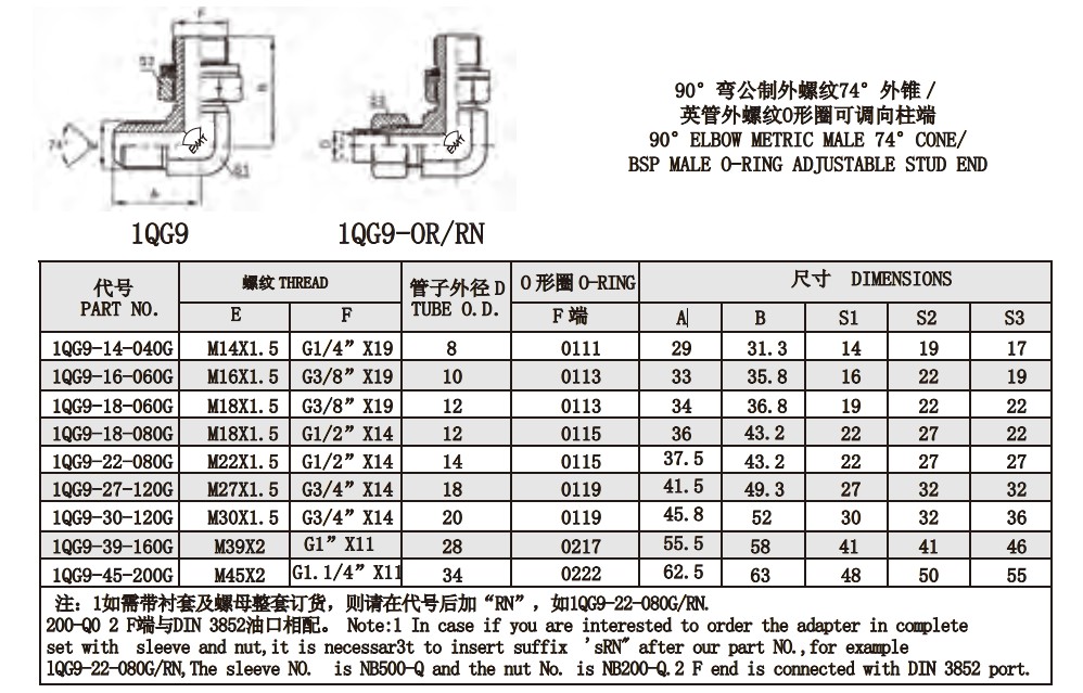1QG9 1QG9-OR/RN 90°彎公制外螺紋74°外錐/英管外螺紋O形圈可調(diào)向柱端