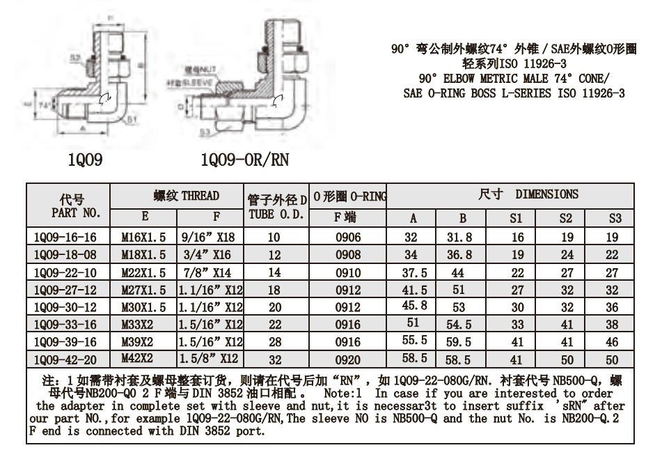 1QO9 1QO9-OR/RN 90°彎公制外螺紋74°外錐/SAE外螺紋O形圈