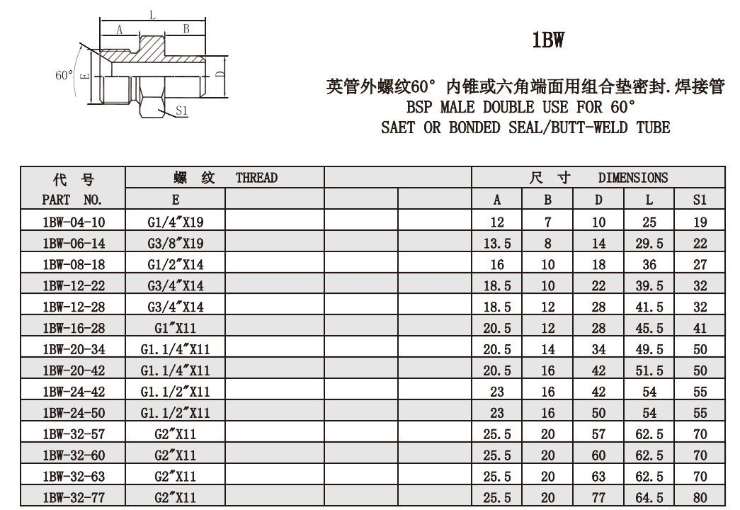 1BW 英管外螺紋60°內(nèi)錐或六角端面用組合墊密封.焊接管