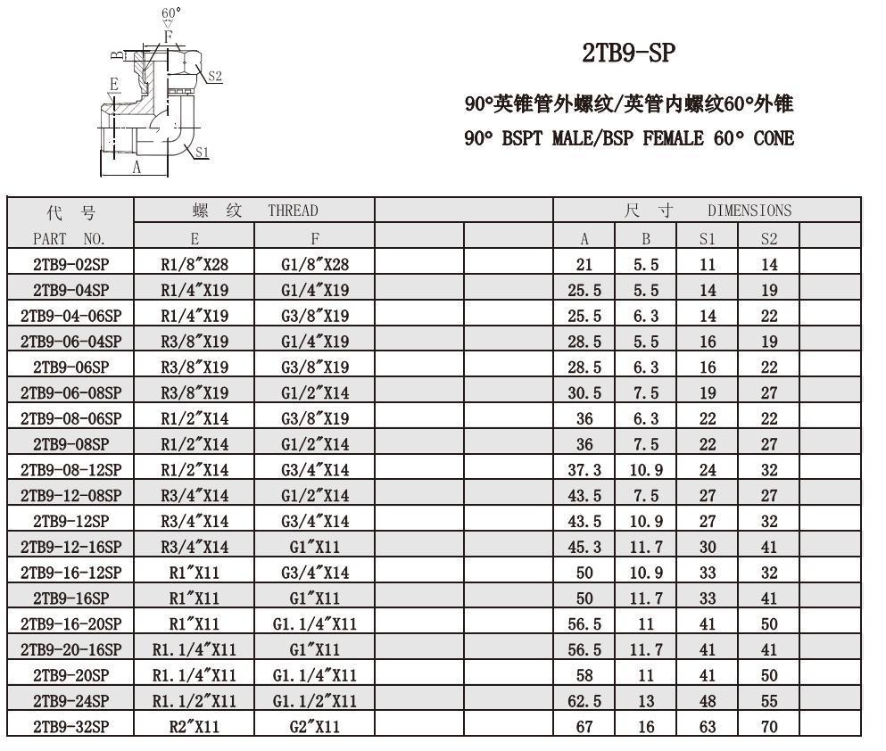 2TB9-SP 90°英錐管外螺紋/英管內螺紋60°外錐