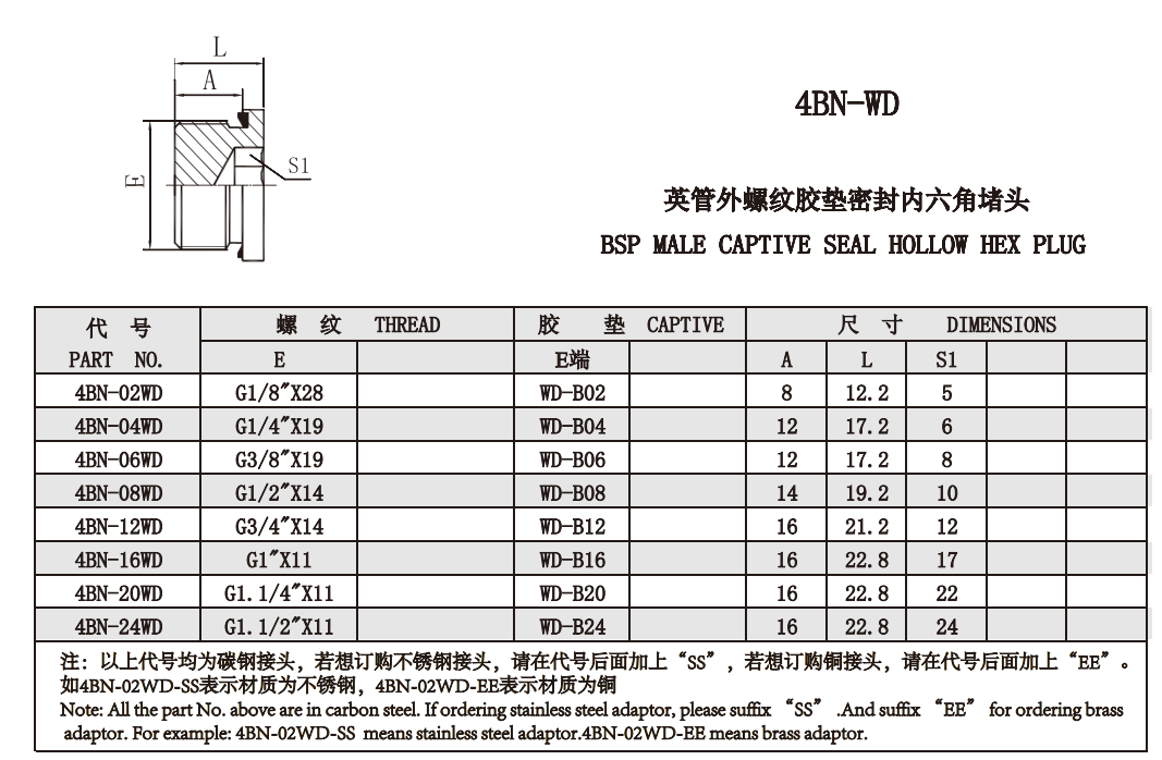 4BN-WD 英管外螺紋膠墊密封內(nèi)六角堵頭