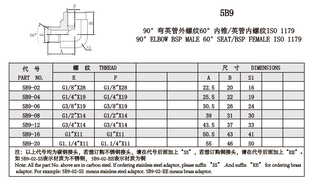 5B9 90°彎英管外螺紋60°內(nèi)錐/英管內(nèi)螺紋ISO 1179