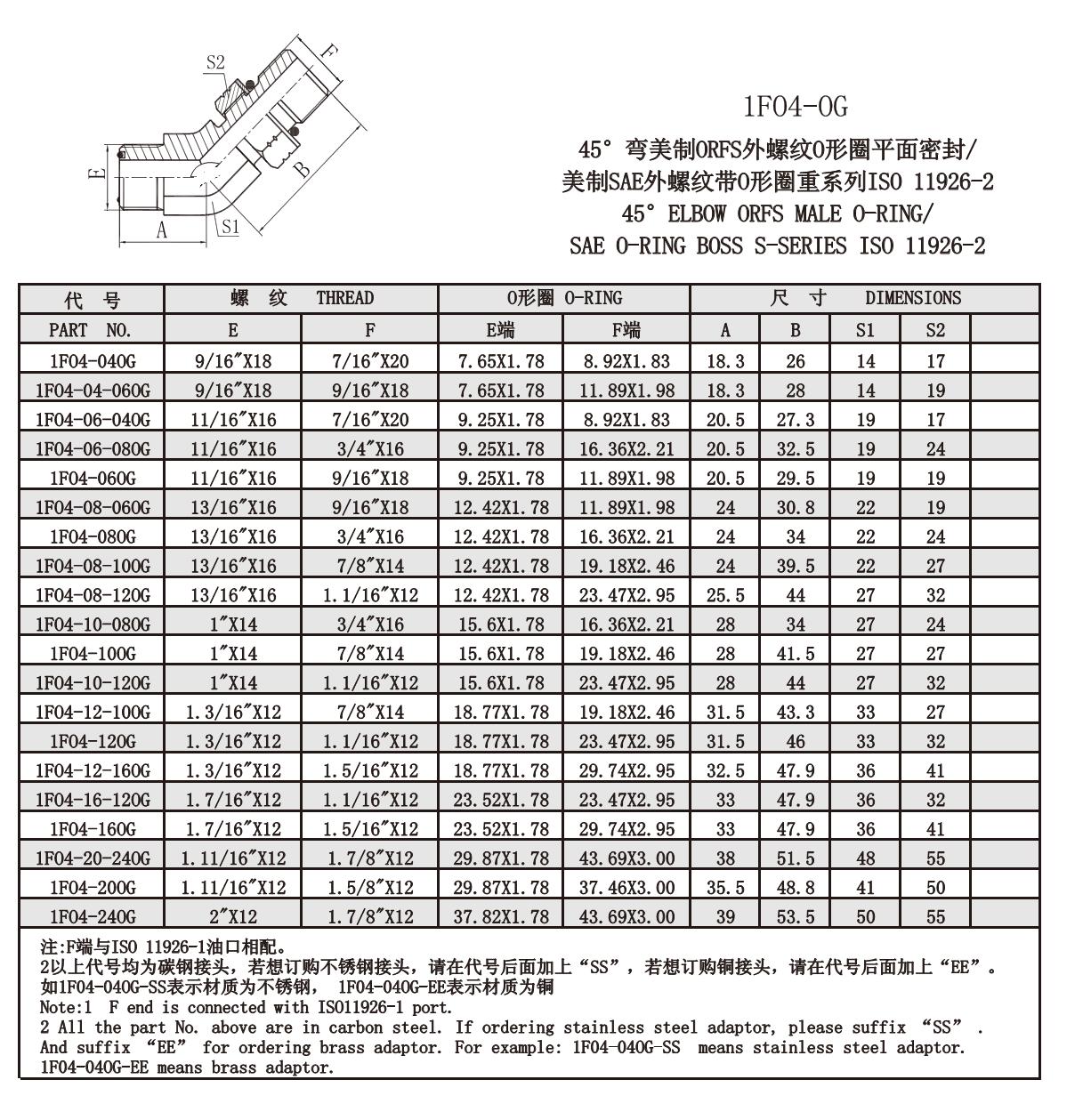 1F04-OG 45°彎美制ORFS外螺紋O形圈平面密封/ 美制SAE外螺紋帶O形圈重系列ISO 11926-2