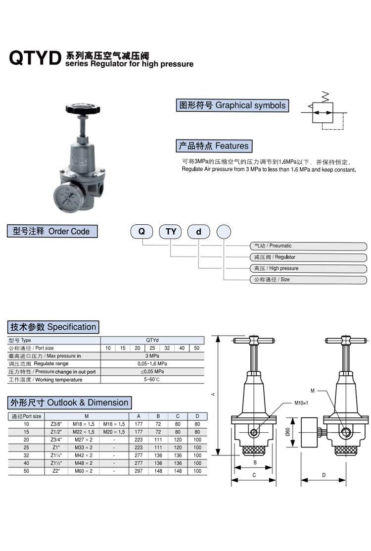 高壓空氣減壓閥 QTYd 系列,可將3Mpa的壓縮空氣的壓力調(diào)節(jié)到1.6Mpa以下,并保持恒定。