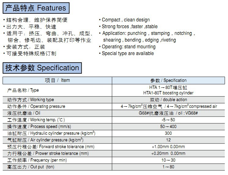 技術(shù)參數(shù) Specification項(xiàng)目 / Item 參數(shù) / Specification產(chǎn)品名稱 / TypeHTA 1~80T增壓缸HTA1-80T boosting cylinder動(dòng)作方式