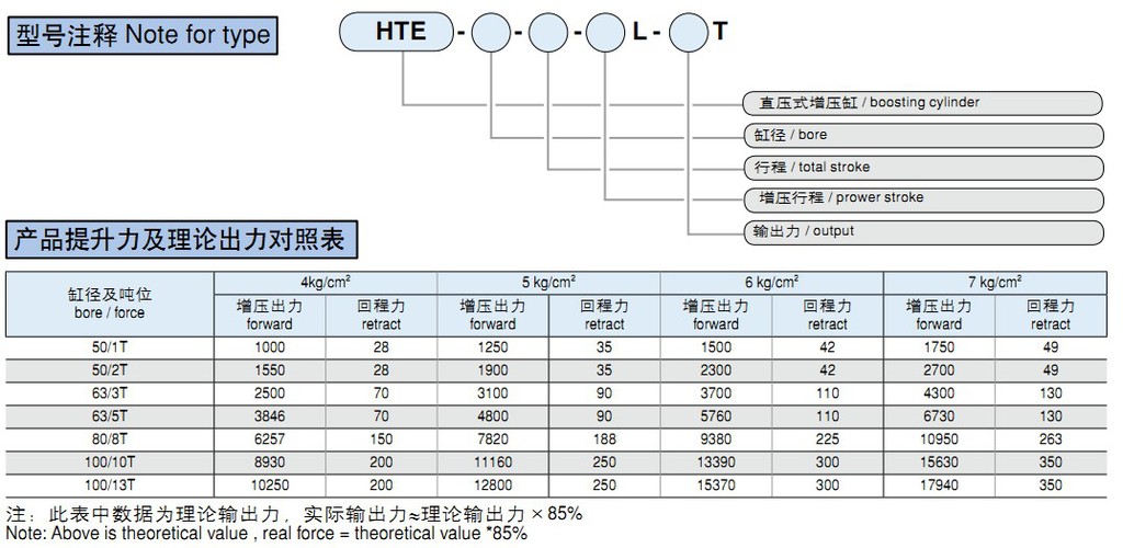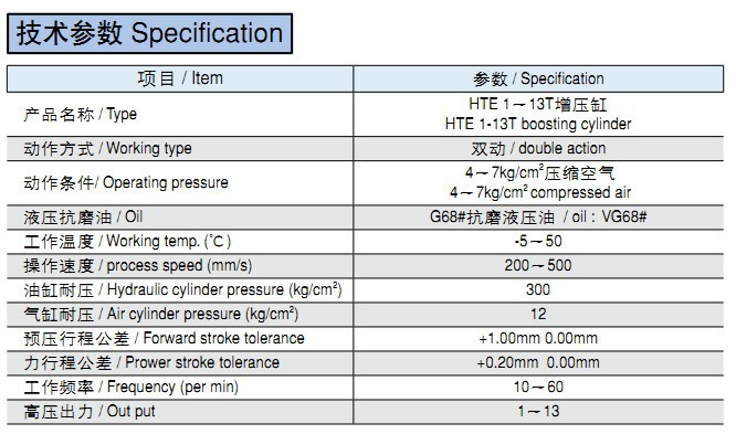 技術(shù)參數(shù) Specification項目 / Item 參數(shù) / Specification產(chǎn)品名稱 / TypeHTE 1~13T增壓缸HTE 1-13T boosting cylind