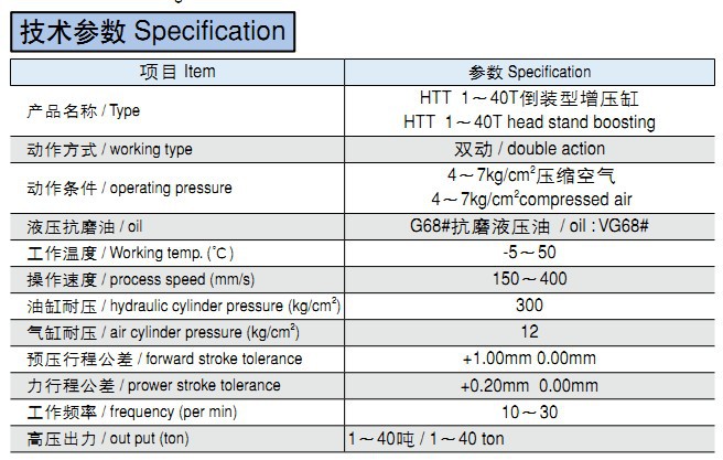 技術(shù)參數(shù) Specification項(xiàng)目 Item 參數(shù) Specification產(chǎn)品名稱 / TypeHTT 1~40T倒裝型增壓缸HTT 1~40T head stand