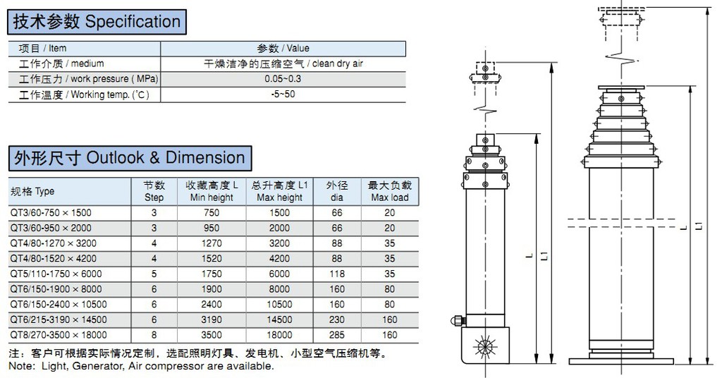 單作用多級升縮氣缸QT系列可按要求非標定制