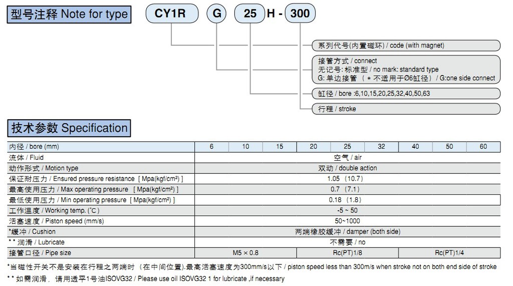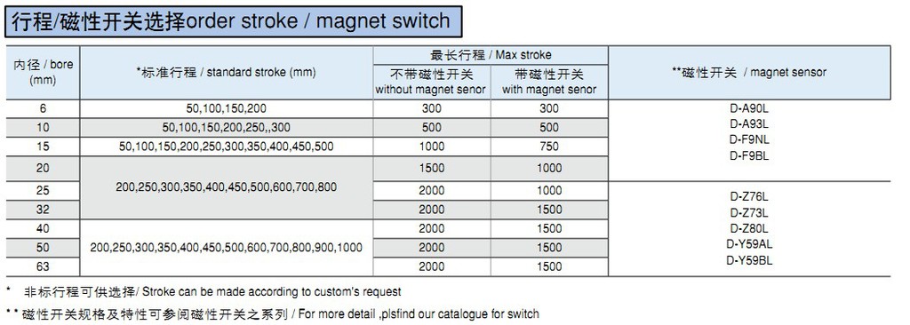 *當(dāng)磁性開(kāi)關(guān)不是安裝在行程之兩端時(shí)(在中間位置).最高活塞速度為300mm/s以下 / piston speed less than 300m/s when stroke not on both end side of stroke