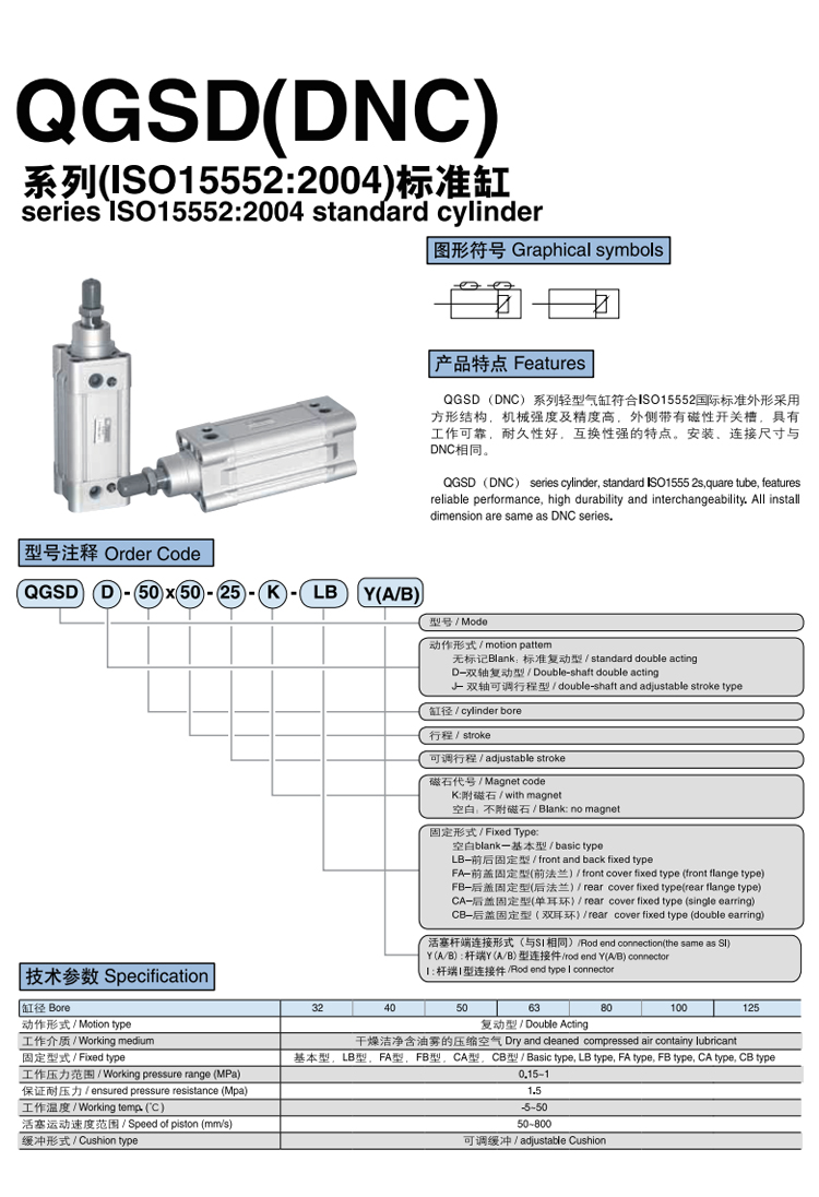 QGSD系列(德)標準氣缸是歐洲型輕型氣缸,結(jié)構(gòu)緊湊,安裝形式和尺寸符合ISO1552國際標準,具有工作可靠,耐久性好,互換性強的特點。ISO15552國標氣缸可非標定制VDMA氣缸非標氣缸生產(chǎn)
