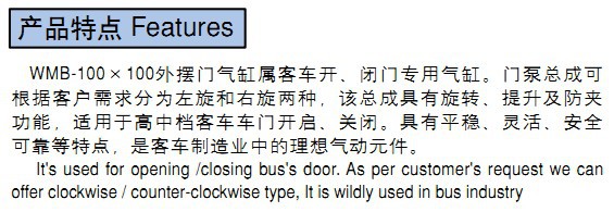 WMB-100×100外擺門氣缸屬客車開、閉門專用氣缸。門泵總成可根據(jù)客戶需求分為左旋和右旋兩種,該總成具有旋轉(zhuǎn)、提升及防夾功能,適用于高中檔客車車門開啟、關(guān)閉。具有平穩(wěn)、靈活、安全可靠等特點(diǎn),是客車制造業(yè)中的理想氣動元件。