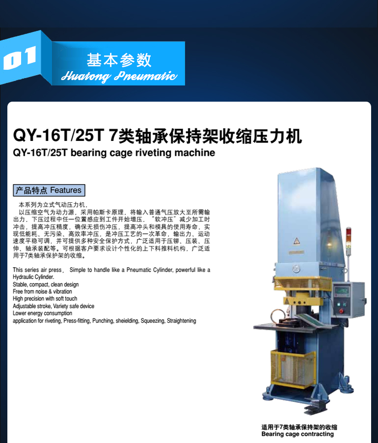 以壓縮空氣為動力源,采用帕斯卡原理,將輸入普通氣壓放大至所需輸出力,下壓過程中任一位置感應(yīng)到工件開始增壓,“軟沖壓”減少加工時沖擊,提高沖壓精度,確保無損傷沖壓,提高沖頭和模具的使用壽命,實現(xiàn)低能耗、無污染、高效率沖壓,是沖壓工藝的一次革命,輸出力、運動速度平穩(wěn)可調(diào),并可提供多種安全保護方式,廣泛適用于壓鉚、壓裝、壓伸、軸承裝配等??筛鶕?jù)客戶要求設(shè)計個性化的上下料推料機構(gòu),廣泛適用于7類軸承保護架的收縮。