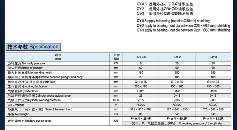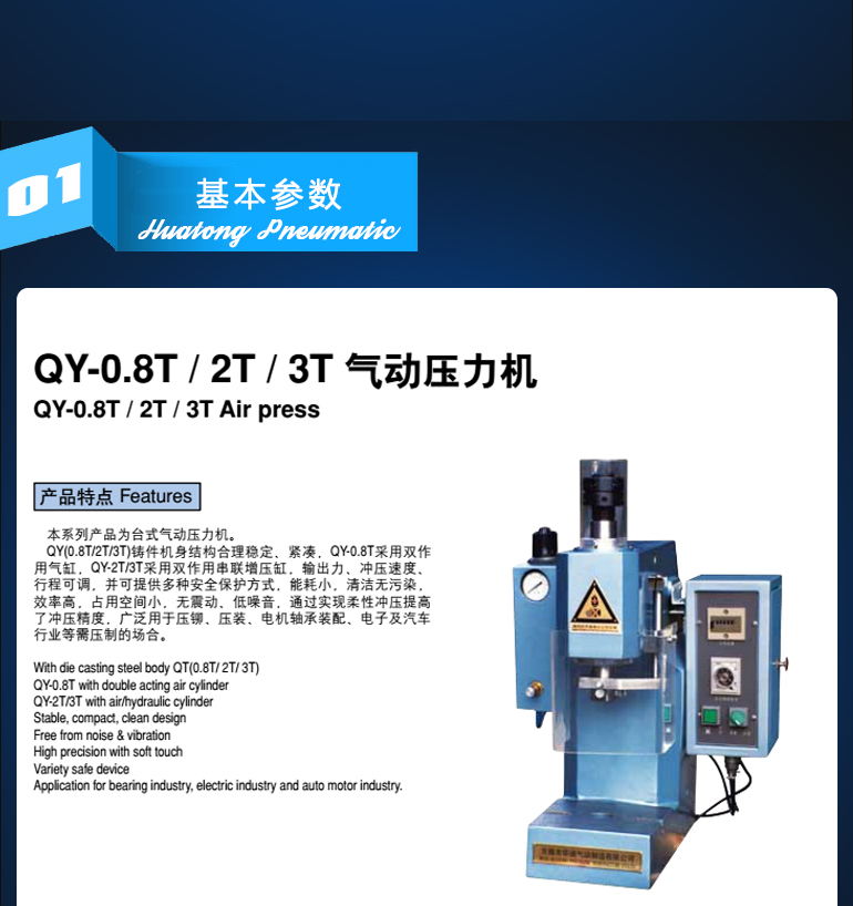 QY(0.8T/2T/3T)鑄件機(jī)身結(jié)構(gòu)合理穩(wěn)定、緊湊,QY-0.8T采用雙作用氣缸,QY-2T/3T采用雙作用串聯(lián)增壓缸,輸出力、沖壓速度、行程可調(diào),并可提供多種安全保護(hù)方式,能耗小,清潔無(wú)污染,效率高,占用空間小,無(wú)震動(dòng)、低噪音,通過(guò)實(shí)現(xiàn)柔性沖壓提高了沖壓精度,廣泛用于壓鉚、壓裝、電機(jī)軸承裝配、電子及汽車(chē)行業(yè)等需壓制的場(chǎng)合。
