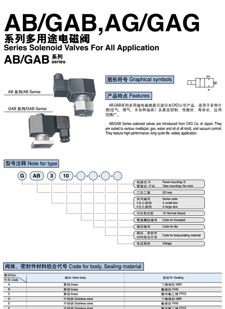 AB/GAB Series solenoid valves are  introduced  from CKD Co. of Japan. They are suited to various media(air, gas, water and oil of all kind), and vacuum control. They feature high performance, long cycle life, widely application.