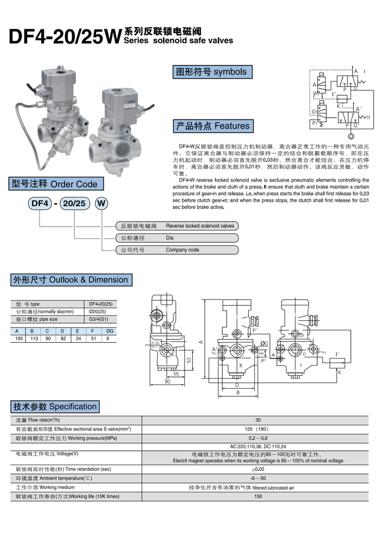 DF4-W系列 反聯(lián)鎖電磁閥 產(chǎn)品特點(diǎn) DF4-W反聯(lián)鎖閥是控制壓力機(jī)制動(dòng)器、離合器正常工作的一種專用氣動(dòng)元件。它保證離合器與制動(dòng)器必須保持一定的結(jié)合和脫霸載順序號(hào),即在壓力機(jī)起動(dòng)時(shí),制動(dòng)器必須首先脫開0.03秒。然合離合才能結(jié)合;在壓力機(jī)停車時(shí),離合