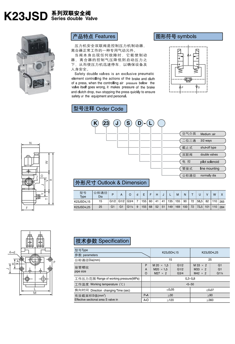 K23JSD系列雙聯(lián)安全閥,壓力機(jī)用安全雙聯(lián)閥, 產(chǎn)品特點(diǎn):壓力機(jī)安全雙聯(lián)閥是控制壓力機(jī)制動(dòng)器、離合器正常工作的一種專用氣動(dòng)元件。