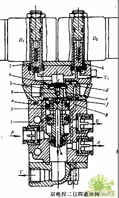 當(dāng)先導(dǎo)閥D2通電、Dl斷電時,動鐵芯6被吸起,c腔內(nèi)的壓縮空氣經(jīng)T1口排出。此時從P到A的壓縮空氣作用在大、小活塞上,因大、小活塞的面積差而產(chǎn)生向上的作用力,使活塞組件2上移。與此同時,密封塞4也上移,并打開閥口3,使活塞組件2上端的壓縮空氣經(jīng)孔6排掉?;钊M件2上移后,P與B通,A與T通(排氣)。此時即使D2斷電,因大小活塞面積差而產(chǎn)生向上的作用力依然存在,所以輸出狀態(tài)也不會改變,即具有記憶功能。氣動電磁換向閥與液壓電磁換向閥一樣,有很多類型,其工作原理也相似,不再贅述。