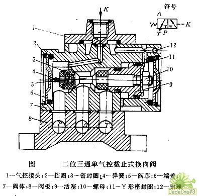圖2所示為二位三通單氣控截止式換向閥的結(jié)構(gòu)圖。當(dāng)K口無信號時。A與T通、閥處于排氣狀態(tài);當(dāng)K口有信號輸入后,壓縮空氣進(jìn)入活塞9的有端,使閥桿5左移、P與A通。圖中所示的為常斷型閥,如果P與T換接則成為常通型。